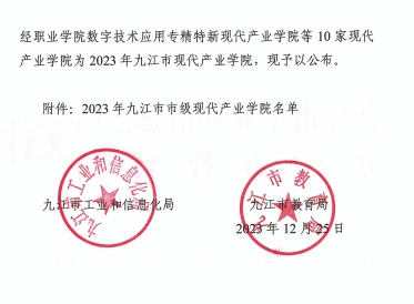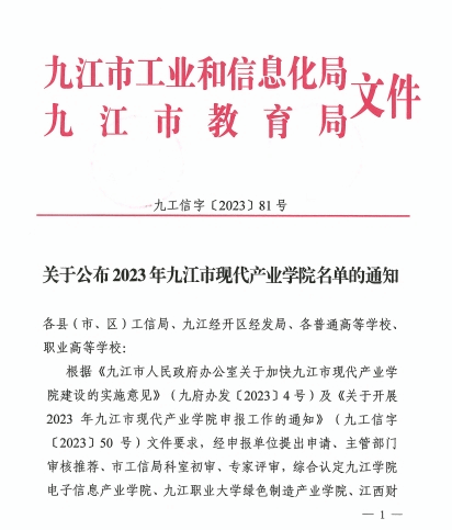 近日,九江市工业和信息化局与九江市教育局联合发布公告,经过严格的评审和筛选,开云官网电子信息产业学院被正式认定为2023年九江市现代产业学院。此次共有10家现代产业学院被认定为2023年九江市现代产业学院,开云官网电子信息产业学院排名第一。