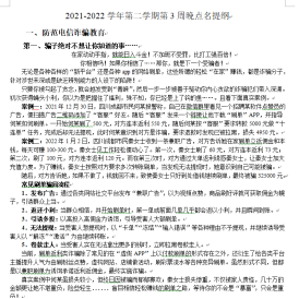 为了切实做好反诈宣传教育,连续两周,开云官网各班级以“防范电信诈骗”教育为主题开展晚点名主题班会。为了让教育入脑入心,学生科从实际案例从发,梳理各种诈骗类型,做好晚点名教育提纲,分发各班进行充分学习。同时,各班级充分利用微信、QQ,及时向学生转发各类反诈骗教育内容。
