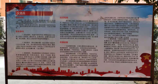 二是制作宣传展板,让优惠政策深入人心。为了强化学生的参军意识,每年的征兵时节,学生科都会做好宣传展板,突出入伍的优惠政策,置于15栋门口,在学生进出时经常看到,并阅读相关政策,做到常提醒,入人心。