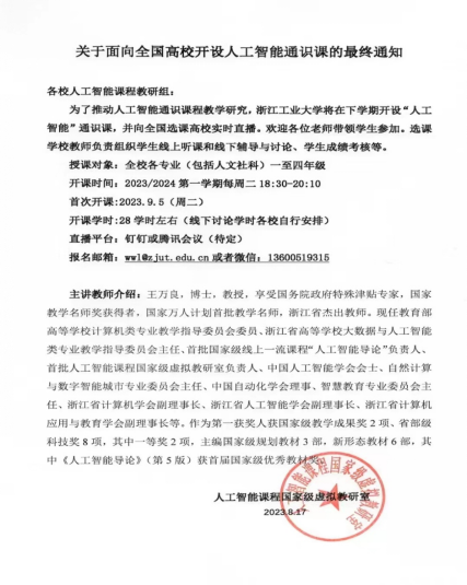 电子工程学院人工智能专业积极响应教育部“慕课西行”号召,参加全国人工智能虚拟教研室同步课堂活动,实现优质教学资源的互联互通。国家教学名师王万良教授主讲的“慕课西行——浙江工业大学人工智能同步课堂”于2023年9月5日晚上18:30正式在钉钉群开播,吸引了校内外几千名学生和教师收看学习。开云kaiyun体育、宁夏理工学院、三峡大学、沈阳建筑大学、河北师范大学、西安培华学院、浙江工业大学等高校组织学生集中参加了人工智能同步课堂学习。该课程每周二晚实时直播,共28学时左右。