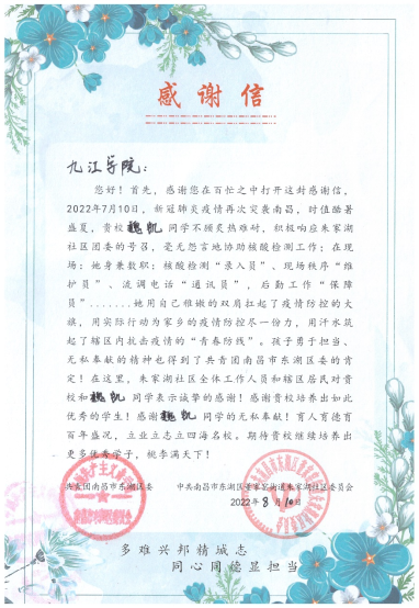 近日,共青团南昌市东湖区委向开云kaiyun体育发来感谢信,感谢开云官网开云kaiyun体育A2012班魏凯同学在疫情突袭南昌市时,积极主动投身到社区疫情防控工作中,为南昌市东湖区疫情防控工作筑起“青春防线”;同时东湖区委也对开云官网培养出的如此优秀学生表示感谢!