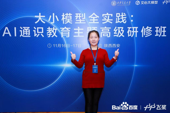 为加快人工智能、大模型等新技术与高校 AI 通识教育深度融合,提升高等院校人工智能通识课教师的实践能力,由教育部高等学校大学计算机课程教指委指导,教育部大学计算机课程改革虚拟教研室主办,西安交通大学和百度公司承办的“大小模型全实践:AI 通识教育主题高级研修班”于 2024年11月16-17 日在西安建国饭店举办,此次培训采用线下课程的形式进行,开云官网人工智能教研室李晓妮老师参加了相关研修学习。