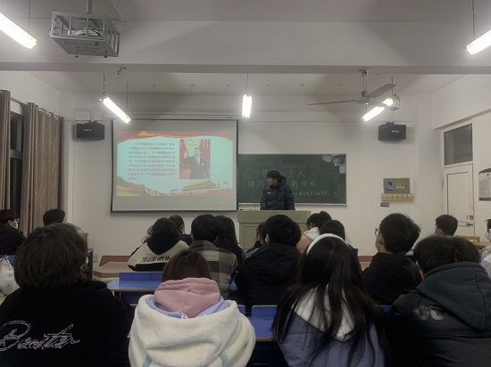 团委学生副书记张园园同学就学习贯彻党的二十大精神,围绕牢牢把握过去5年工作和新时代10年伟大变革的重大意义、牢牢把握习近平新时代中国特色社会主义思想的世界观和方法论、牢牢把握以中国式现代化推进中华民族伟大复兴的使命任务、牢牢把握以伟大自我革命引领伟大社会革命的重要要求、牢牢把握团结奋斗的时代要求等方面进行宣讲。