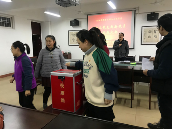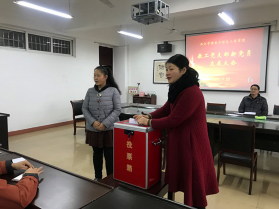 会议由电子学院教工党支部书记杨长春同志主持,会议首先由武良丹委员介绍电子学院教工党支部党员组成情况,然后由发展对象谢新文同志宣读自己的入党志愿书,汇报自己对党的认识、入党动机、本人经历、工作情况等,表达了自己渴望加入党组织的强烈愿望。接着由入党介绍人胡日新和武良丹同志介绍谢新文同志的情况。进入大会讨论阶段,党员同志们一致认为谢新文同志具有较高的政治思想理论水平和良好的群众基础,以及一贯踏实肯干的工作作风。大会采取无记名投票方式进行表决,全体党员一致同意接收谢新文同志为中共预备党员。谢新文同志承诺一定不辜负领导和同事们的期望,以后会更加严格要求自己,牢记党的宗旨,不断学习先进的教育教学理念,教好每一位学生,真正发挥党员的先锋模范作用。