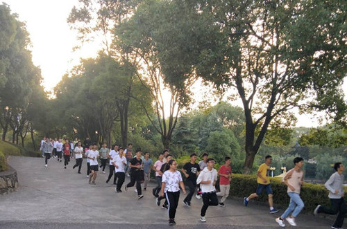 东升的旭日将阳光照射在每一位大一新生的脸颊上。各班以班级为单位站成整齐的队列整装待发。在纪检部点完名后,各班体育委员在队伍的最前方带领着班上同学围绕着蝶湖开始了跑步。同学们矫健的的身影迎着晨光随风而动,井然有序的晨跑活动形成了校园一道靓丽的风景线。