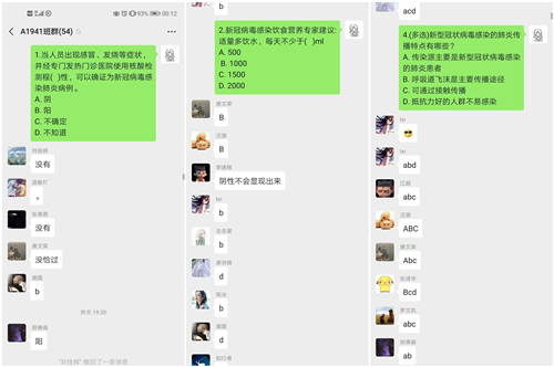 活动开始前,团支书组织班上同学签到,以确保全体同学都能参与本次活动。此次团课活动通过文字、语音、图片与视屏直播等交流形式。团支书首先向同学们概括了此次疫情的发展及影响,同时用实时数据变化加深了同学们对此次疫情严重性的认知;随后,从多个方面讲述了党和政府关于疫情防控的一系列重大决策部署,并向同学们介绍疫情中的杰出人物——钟南山院士、李兰娟院士、张定宇院长、李文亮医生等。在敬佩他们崇高的医德和对疫情防控做出的杰出贡献之余,同学们纷纷表示,作为新时代青年大学生,要以他们为榜样,努力学好专业知识,练就过硬本领,毕业后为人民群众服务,为实现中华民族伟大复兴的宏伟事业奉献出自己全部的力量。接着,参与了返乡大学生团员防疫志愿活动的同学纷纷发表了在防疫期间的经历与感想,也号召同学们要勇于承担“新时代青年的责任与使命”。为增强开云官网团员青年对此次线上团课的参与度,个别班级进行了有关防疫问题的有奖问答活动,同学们踊跃参加,使大家的防疫知识得到提升。最后,全体团员青年对在一线奋战的医护工作者表示诚挚的感谢并致以崇高的敬意。