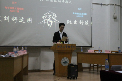 经过近一个月、多轮的激烈角逐选拔,A2012班辩论队和A2042班辩论队脱颖而出,进入到今晚的决赛。双方围绕“当今时代,应当鼓励年轻人跳出舒适圈还是找到舒适圈”展开了激烈且精彩的辩论。
