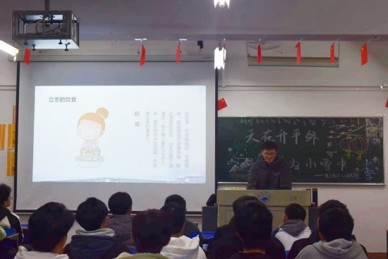 活动中,各班团支书介绍了我国传统二十四节气的由来,“小雪”节气的特点。同学们积极参与,不仅诵读有关小雪的古诗词,感受经典,共享国学魅力,还积极分享自己家乡“小雪”的民间文化习俗,包括腌咸菜、品尝糍粑、晒鱼干、吃刨汤、酿小雪酒等。