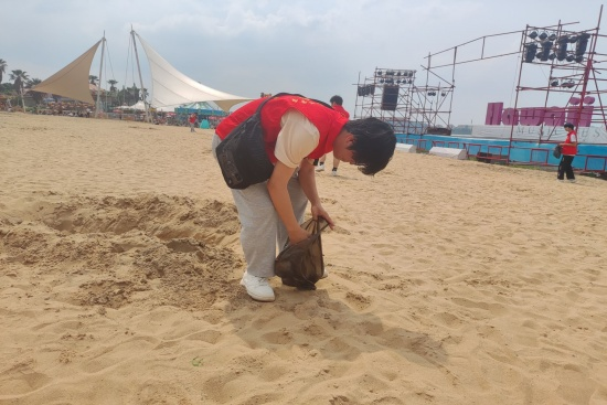 在活动中,志愿者们分工明确,干劲十足。他们有的负责捡起沙滩上的卫生纸,有的专注于清理枯枝落叶和烟头垃圾,还有的对路上塑料瓶进行清理。“志愿红”成为海韵沙滩公园里一道亮丽的风景线。