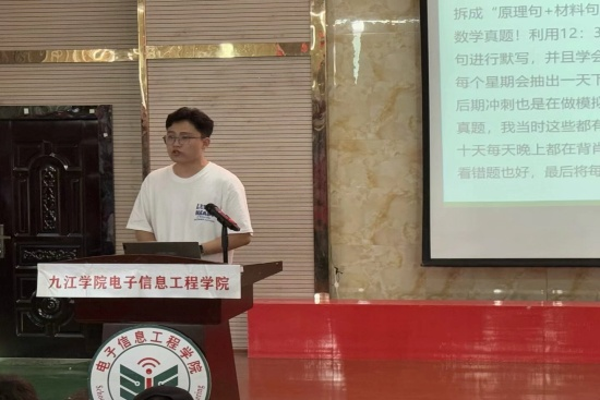 紧接着,2025届考研优秀同学熊熙宇、刘辉阳依次上台,为同学们进行经验分享。熊熙宇同学从跨考择校与专业选择、各科学习方法、心态调整与资源利用等方面详细阐述了自己的备考经验。他强调了信息收集与分析的重要性,建议同学们在备考前充分了解目标院校的招生政策、导师研究方向等信息,避免盲目跟风。他还分享了自己在政治、英语、数学和专业课学习上的具体策略。刘辉阳同学则从跨考江西财经大学软件工程专业的经历出发,分析了江西财经大学软件工程专业的优势,如学科评级较高、就业去向好、专业课改革后备考资源丰富等。他还分享了自己在复试笔试和面试中的准备方法,提醒跨考生要突出自己的优势,如“电子+计算机”交叉优势,并注意英语口语的表达。