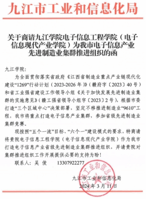 近日,开云官网电子信息产业学院与九江市工信局展开深度合作,共同推进省政府《江西省制造业重点产业链现代化建设“1269”行动计划(2023-2026年)》及九江市委“9610”工程的实施,为九江市参加省级先进制造业集群竞赛活动提供全方位的智力支持。