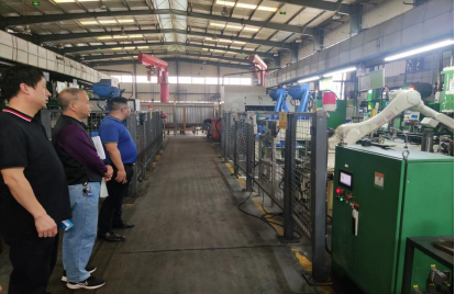 九江洋泰金属制品有限公司副总经理刘顺芳和设备科科长桑培超对学院领导的到访表示热烈欢迎,并带领大家参观了厂房车间,重点介绍了公司运用PLC设备控制的空调压缩机的机器人自动化生产线,并详细讲解了该项目情况及主要成果。